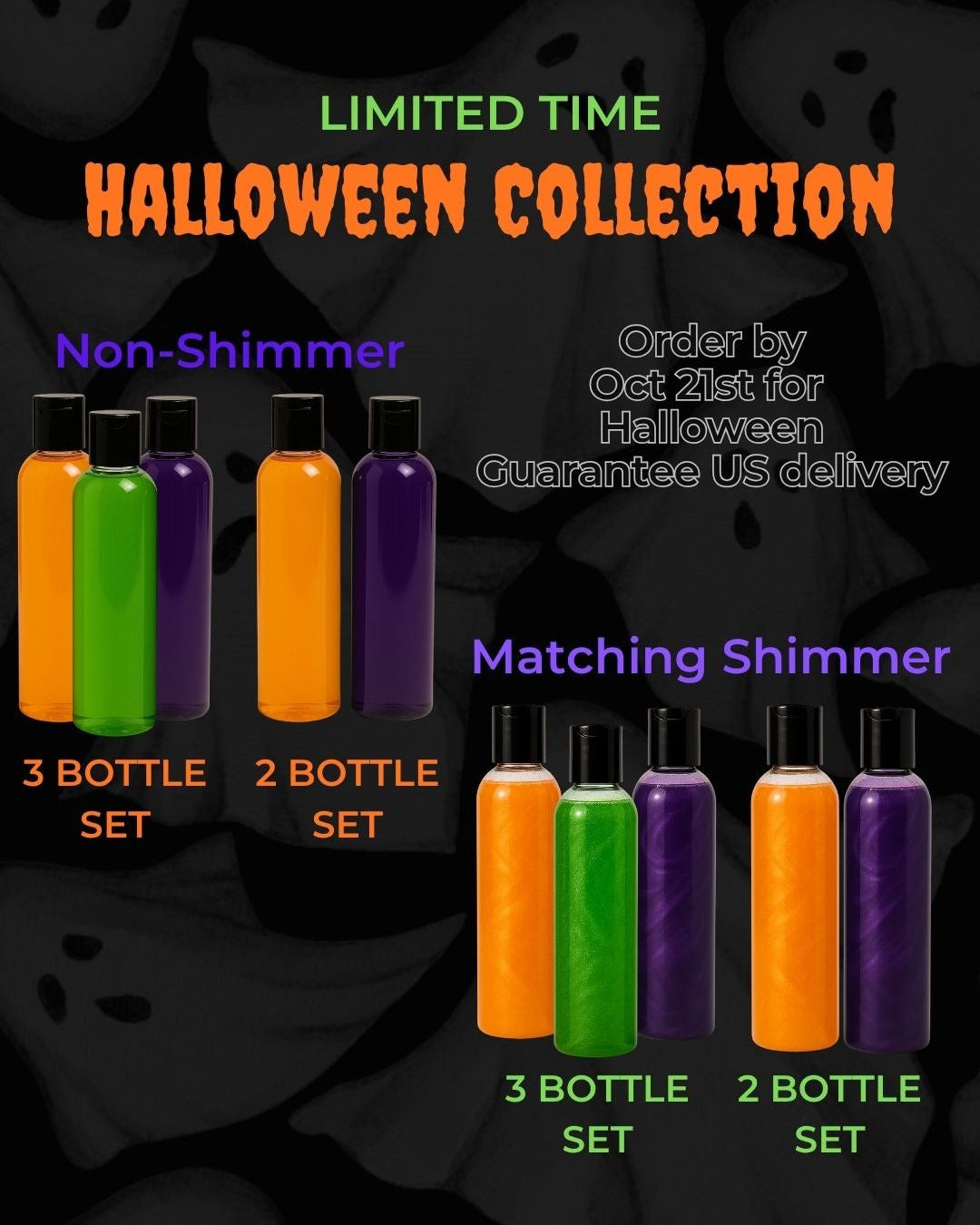 Limited Halloween Edition providing you Orange, Green, and Purple lube in color-matching shimmer or